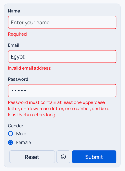<Form initialValues={{ email: '', password: '' }} onSubmit={(values) => ...} validationSchema={...} > <Input formName="email" label="Email" placeholder="Enter your email" /> <Input formName="password" label="Password" placeholder="Enter your password" secureTextEntry /> <Button form="submit"> Submit </Button> <Button form="reset" variant="secondary"> Reset </Button> </Form>